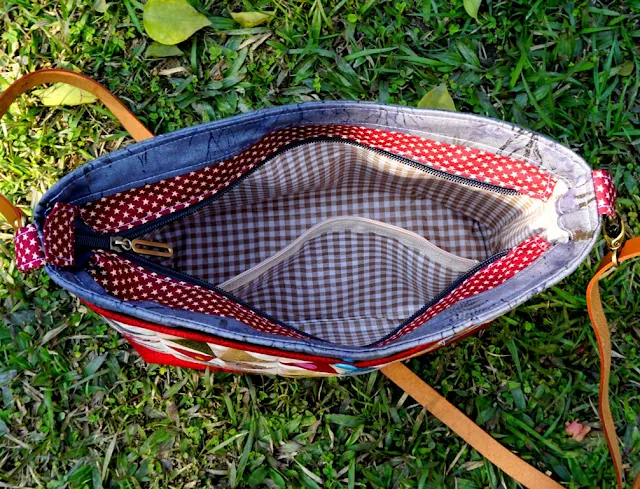 Before going to Indonesia, I managed to finish a quilted handbag. The patchwork was a leftover block from this wall hanging. It was a sudden decision. As usual, before leaving for a holiday I always have this urge to make a few projects. I am glad I did it though. The idea was to make a small sling bag just for a phone and wallet. But since the block was pretty wide, I decided to add a faux leather accent at the bottom. I did not have time to make the handle though. So I just used the handle from another bag! As long as it served the purpose, it's fine. I always prefer a fabric bag as it's lighter and even if you fill it up with lots of stuff, like passport wallets, a cardigan, etc it is still light.